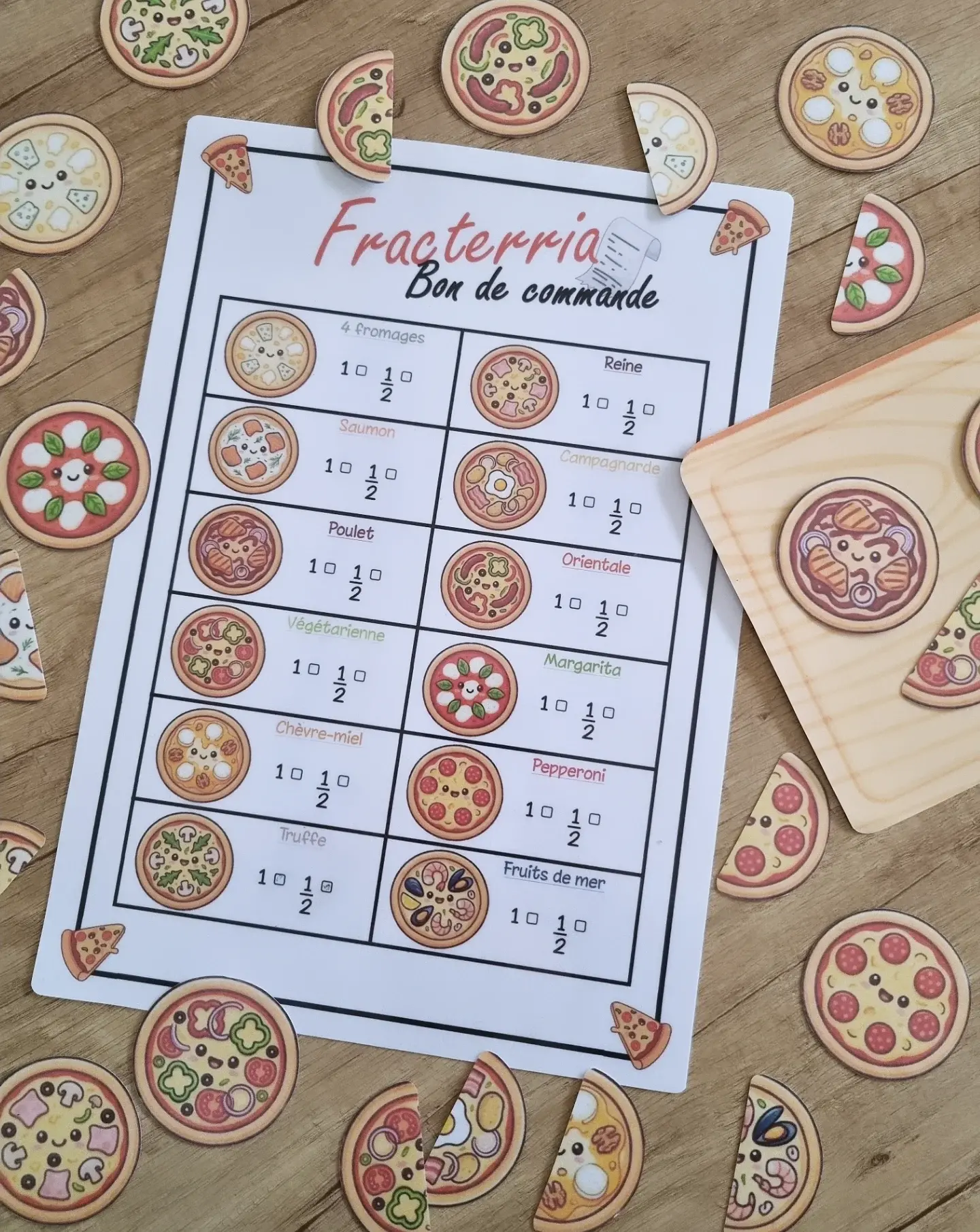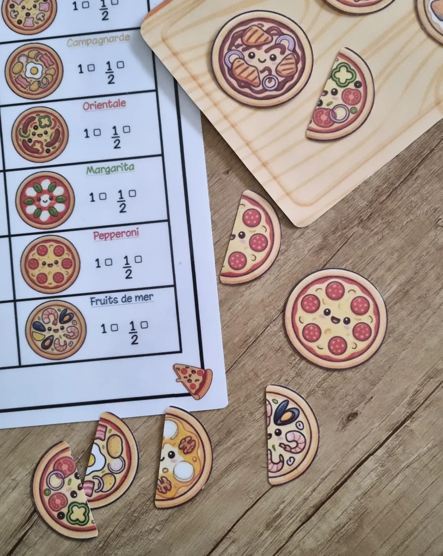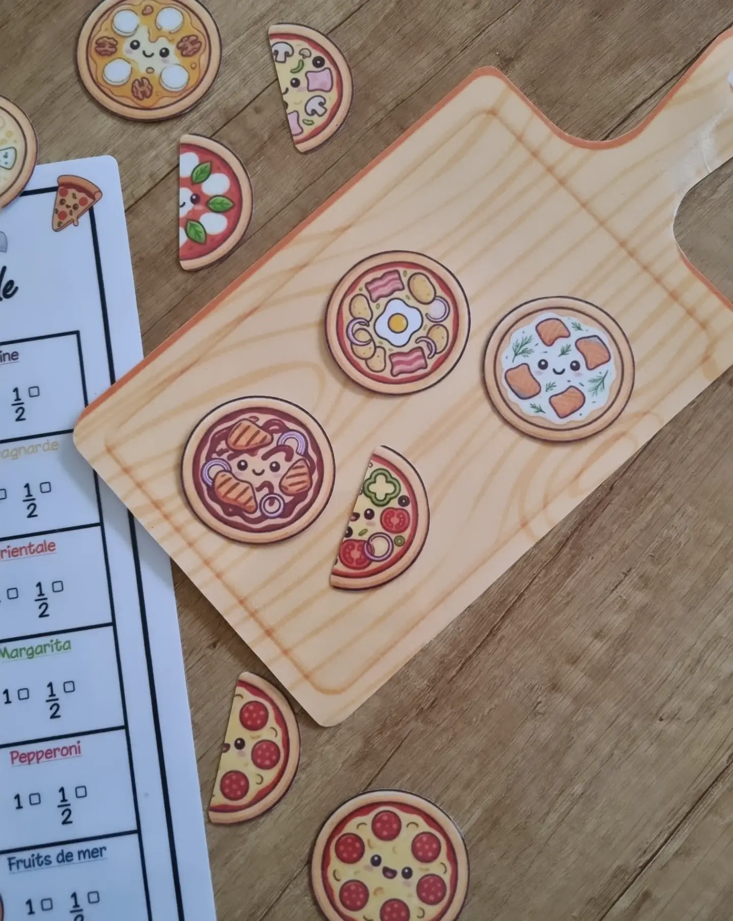 Dès le cycle 2, cet atelier permet à tes élèves de travailler sur la notion de fractions et d'en réinvestir les premières connaissances : le tout et le demi. Le principe est simple en duo, un élèves est le client et l'autre le pizzaiolo. Le premier a le bon de commande et il coche ce qu'il veut commander comme pizza et il donne ensuite sa fiche au pizzaiolo qui va lui donner des pizzas entières ou des demis sur une planche. Un jeu et un atelier simple qui leur permet de comprendre le sens et de réinvestir leurs premières connaissances.
